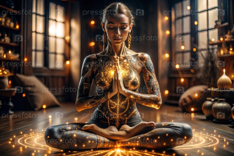 Концепция эзотерической духовной медитации, женщина в позе лотоса.Человеческая медитация, духовность и активация чакр, мистический дух