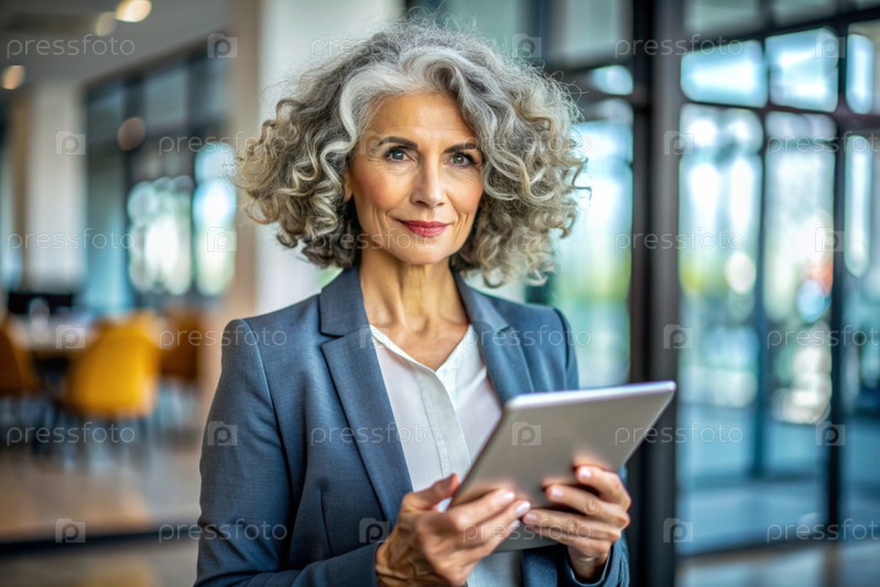 Деловая пожилая женщина с кудрявыми волосами. Она носит простую куртку. В руках таблетки. Бизнесмен смотрит на экран своего смартфона