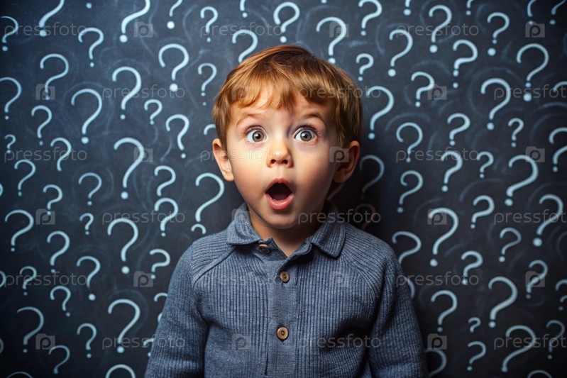 Развитие и образование детей. удивленный мальчик на темном фоне с вопросительными знаками. мозговой штурм, вопросы детей и концепция идеи