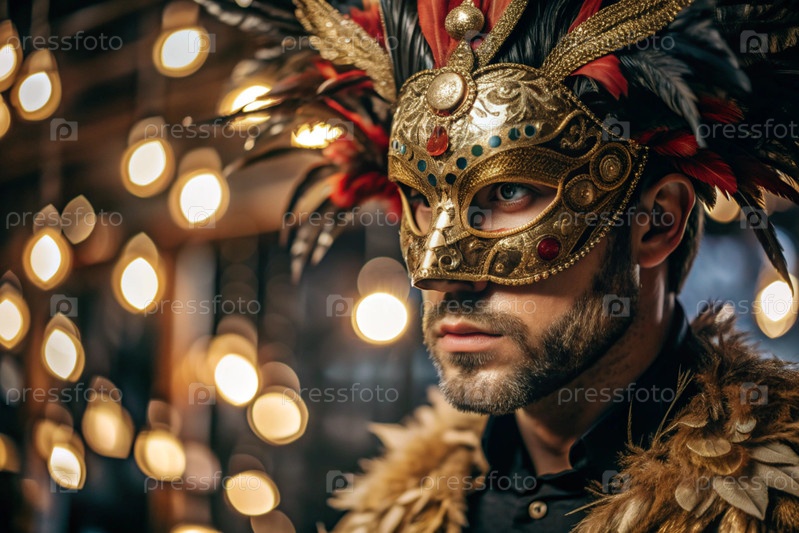 Карнавал Венеции. Близкий план человека в богато украшенной карнавальной маске. Яркие цвета передают атмосферу празднования и роскоши