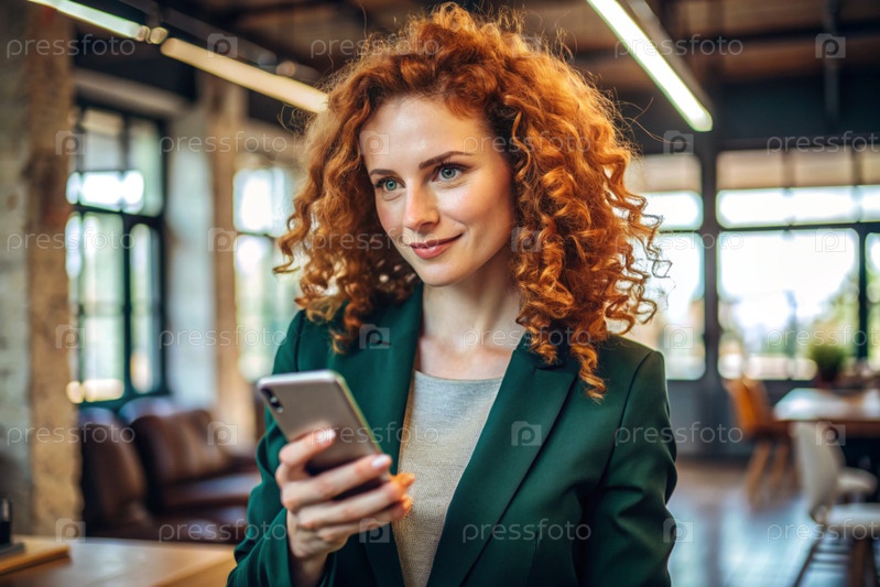 Деловая женщина с локонами красных волос и веснушками. Она одета в обычное зеленое пиджак. В руках смартфон. Небольшой бизнесмен смотрит на свой мобильный телефон