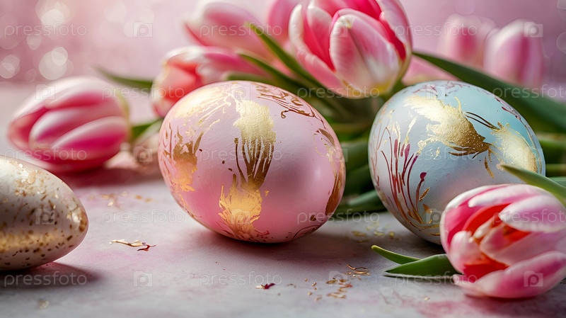Нежные пасхальные яйца в розовых, золотых и фиолетовых тонах и цветы тюльпанов на пастельном акварельном фоне с деликатными венами