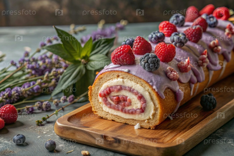 Швейцарская губка с малиной, вкусный фруктовый и сливочный десерт наполненный кремовым сыром, украшенный свежими малинами