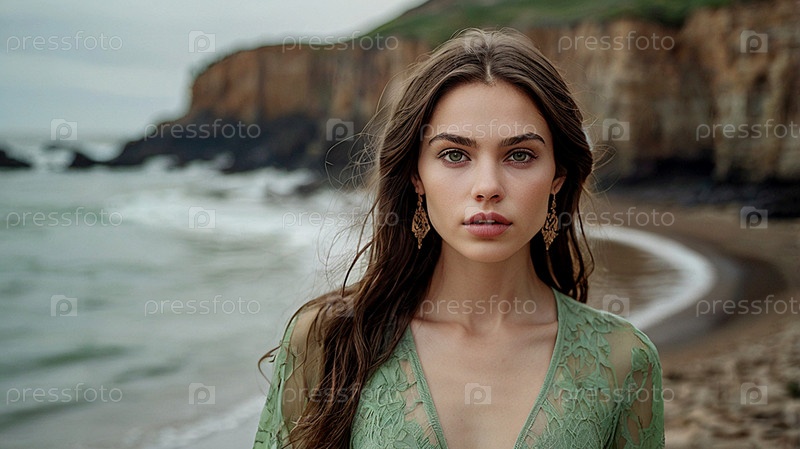 Портрет красивой женщины на пляже перед морем.Романтическая, спокойная и чувственная фотография девушки в проветренном нежном платье
