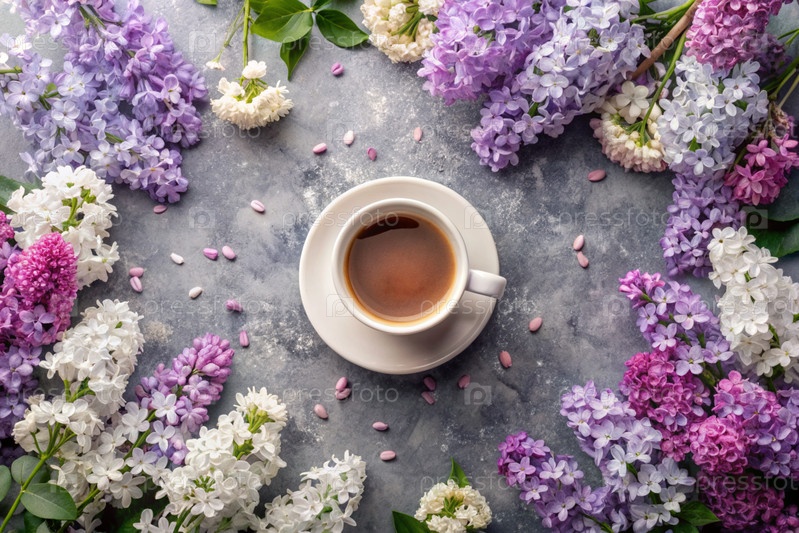 Красивая открытка. Кофейная чашка с тарелкой и лилой. Прекрасный натюрморт. Весна, лето. Концепция доброго утра