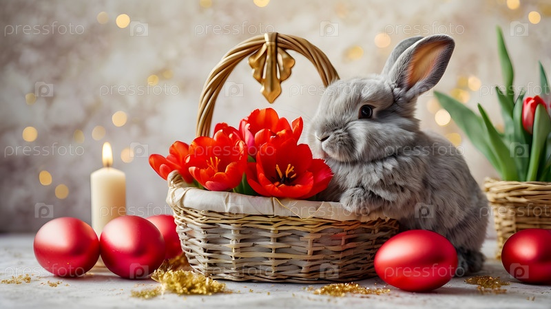 Концепция ярких пасхальных праздников - яркие пасхальные яйца в корзине из колючки, кролик и красные цветы на пастельном фоне воды
