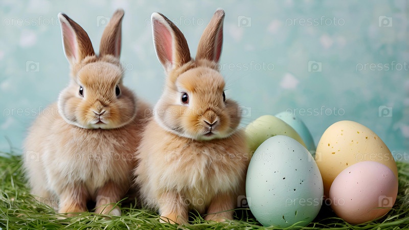 Концепция яркого пасхального праздника: нежные пасхальные яйца, кролики на пастельном фоне