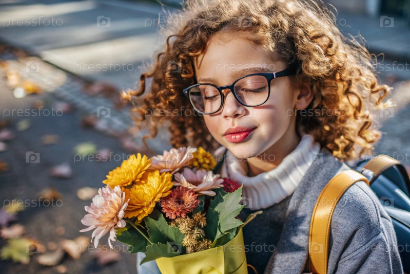 Красивая маленькая кудрявая девочка в очках и букете осенних цветов ходит в школу впервые. Ребенок со школьной сумкой, книгой и цветами. Малыш на городской улице. Возвращение к школе