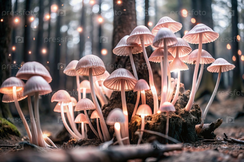 Ядовитые грибы. Жабы. Галлюциногенные грибы. Светящиеся грибы. Изображение для иллюстрации тем, связанных с природой, фантазией, сказками и магией