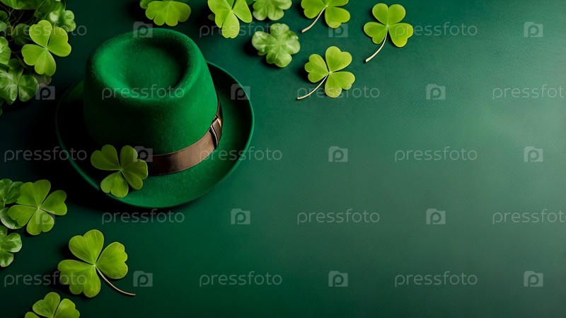 День Святого Патрика, 17 марта.Зелёный фон с листьями клевера и шапкой лепрекона.Копия плоского пространства