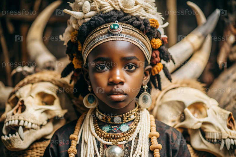 Красивая африканская девушка в традиционном национальном костюме. с костями. портрет символизирует традиции, культуру и красоту африканского народа