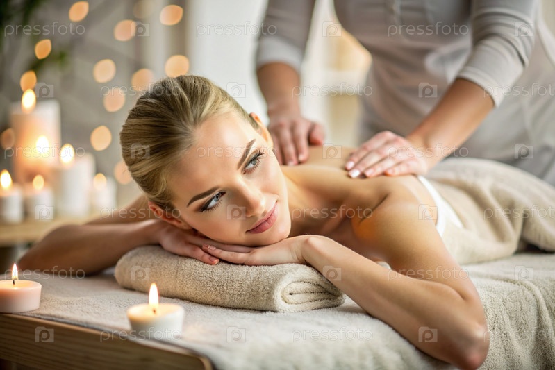 Баннер для профессиональных массажных салонов.Молодая, красивая блондинка наслаждается массажем в современном спа при свечах.Освобождение и гармония, уход за телом