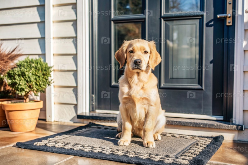 Щенок терпеливо сидит у входной двери, с нетерпением ждет своего хозяина и гуляет вместе с ним