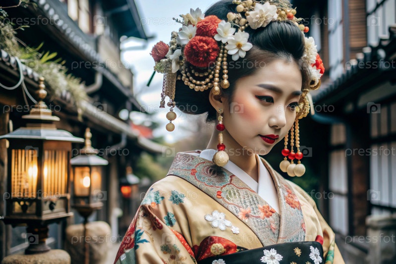 Японская девушка в традиционном национальном костюме - кимоно. На фоне домов, фонарей и вишневых деревьев портрет символизирует традиции и культуру народа Японии