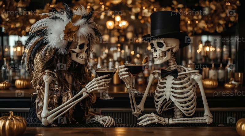 Пара любителей скелетов с коктейлями в баре.Хэллоуин или День мертвых