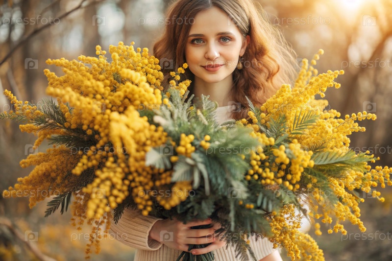 Красивая девушка с пушистым букетом мимозы. Близко Концепция весны и Международный женский день 8 марта