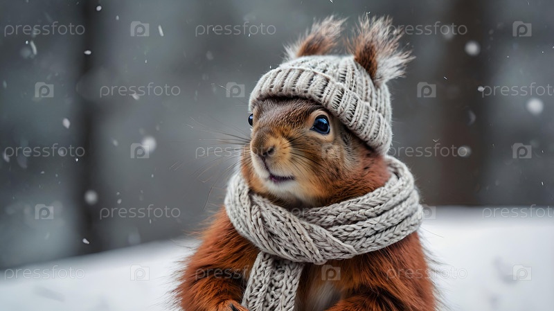 белка с большими щеками, одетая в уютную мягкую серую тёплую одежду, шляпу и шарф на зимнюю тематику