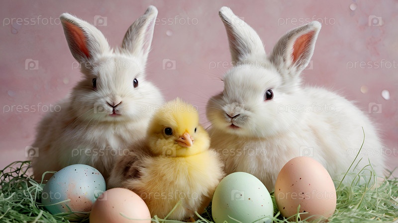 Концепция яркого пасхального праздника: нежные пасхальные яйца, кролики и куры на пастельном фоне