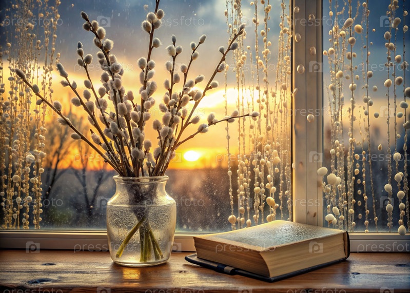 Большой план букета ивы в стеклянной вазе и книги Библии на фоне старого белого окна с капельками дождя на стекле и заходящим солнцем