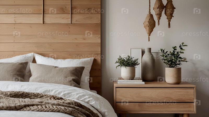 Японский стиль.Интерьер современного дома.Минималистический уютный бежевый интерьер спальни с головной доской, льняной тканью и ночным столом