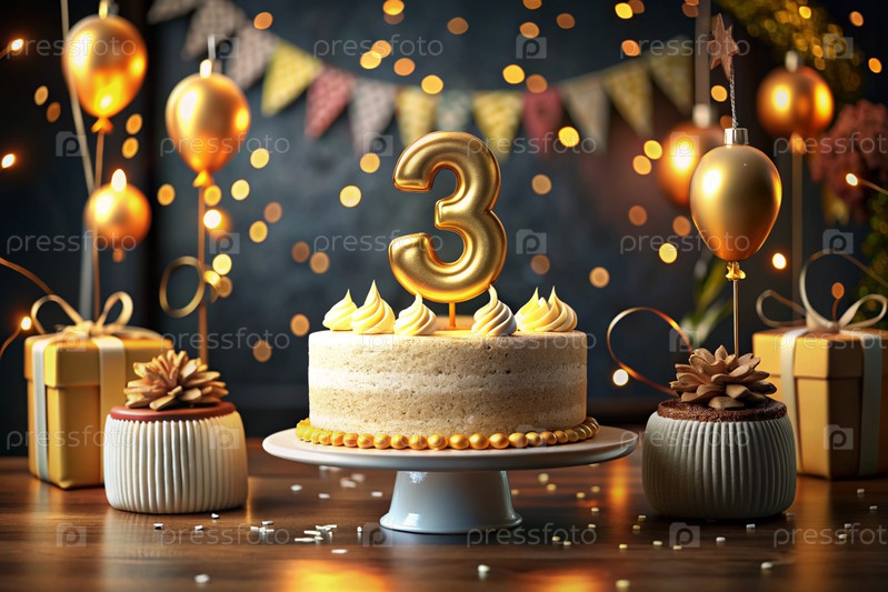 Торт для детской вечеринки. На торте номер 3. На заднем плане есть воздушные шары и красивая фотозона. Концепция - это день рождения детей