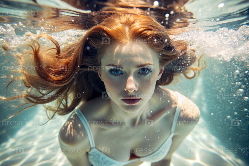 Портрет красивой рыжеволосой девушки в модном белом платье под водой на глубине