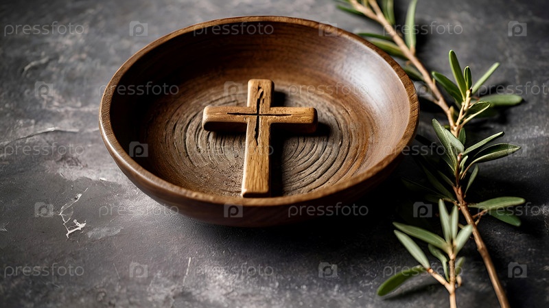 Религия, вера, литургия, Пепельная среда.Огромное заимствование: деревянный крест, церемониальная пепла и оливковая ветвь на сером фоне