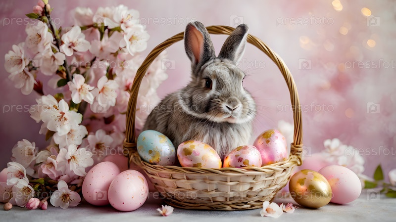 Концепция яркого пасхального праздника: нежные пасхальные яйца в корзине из колючки, кролик и деликатные розовые цветы на пастельно-водном фоне
