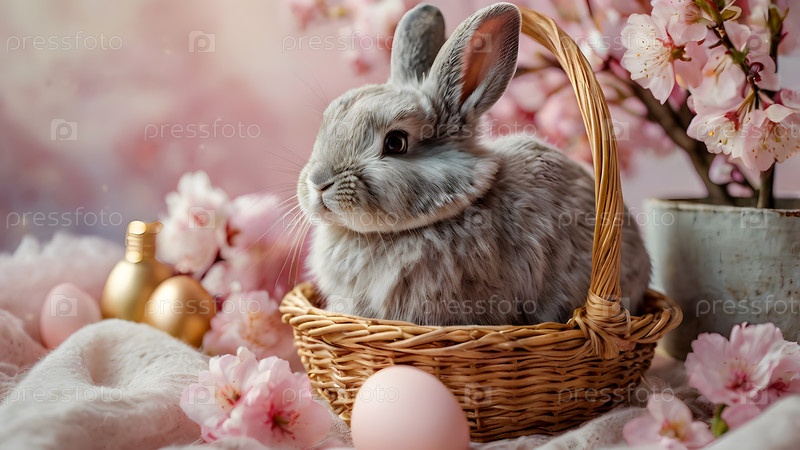 Концепция яркого пасхального праздника: нежные пасхальные яйца в корзине из колючки, кролик и деликатные розовые цветы на пастельно-водном фоне