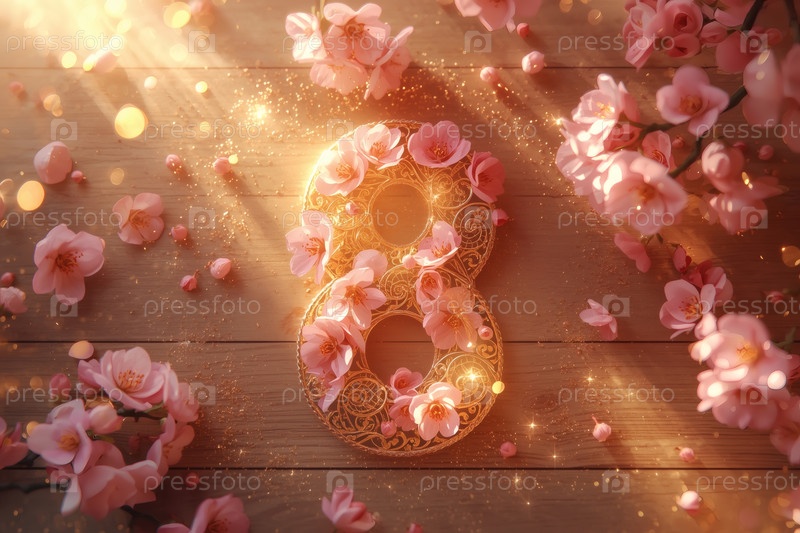 Международный женский день. праздник приходится на 8 марта. баннер, флаер. праздничный мягкий розовый цветочный фон с номером 8