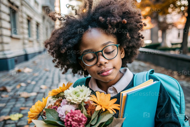 Красивая афроамериканка на очках с букетом осенних цветов впервые идет в школу. Ребенок со школьной сумкой, книгой и цветами. Малыш на городской улице