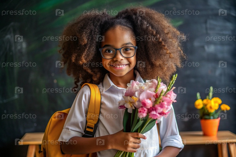 Чернокожая африканская девочка - первоклассница, которая носит очки. Букет цветов. Ребенок впервые ходит в школу. Ребёнок с рюкзаком, книгой и цветами. Возвращение к школе