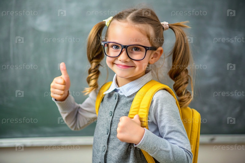 Красивая девушка в очках показывает класс своей рукой. Ребенок идет в школу впервые. Ребёнок с школьной сумкой и книгой. Ребенок в классе со доской на заднем плане. Назад в школу