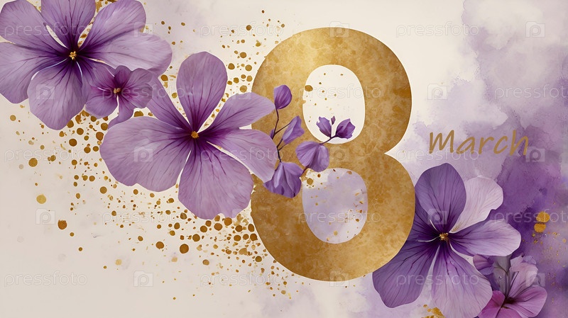 Международный женский день. праздник приходится на 8 марта. баннер, флаер. торжественный, нежный фиолетовый цветочный фон номер 8