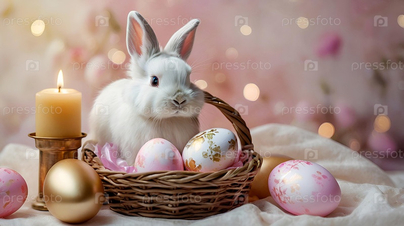 Нежные пасхальные яйца, белый кролик и нежные цветы тюльпанов на пастельном акварельном фоне с нежными венами