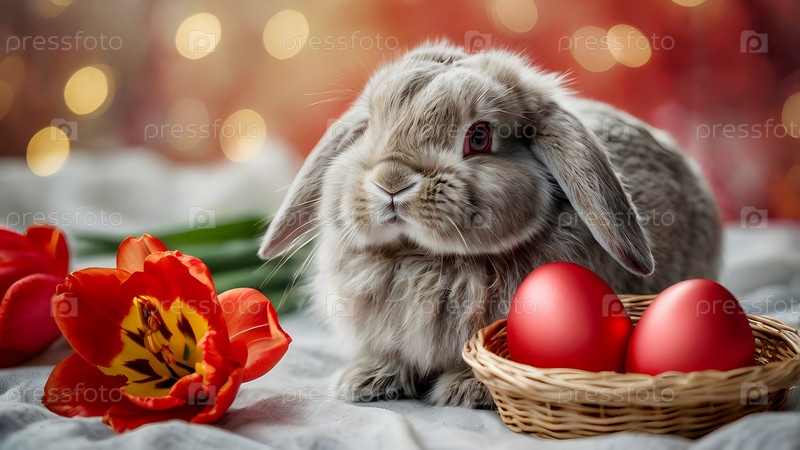 Концепция ярких пасхальных праздников - яркие пасхальные яйца в корзине из колючки, кролик и красные цветы на пастельном фоне воды