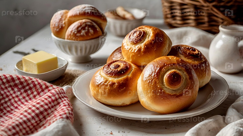 Свежие домашние выпечки на кухонном столе. свежие вкусные булочки в пекарне. свежевыпеченные мучные выпечки