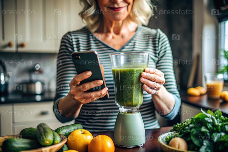 Пожилая женщина на кухне смотрит на рецепты здоровой пищи по телефону и готовит овощный коктейль из брокколи в блендере