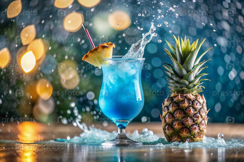 Стакан вкусного синего коктейля Pina Colada перед бассейном. алкогольный коктейль сочный фруктовый синий с ликером, кубиками льда и ананасом