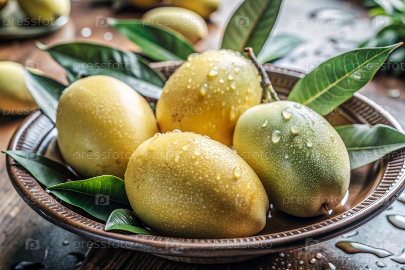 Свежие манго. Вкусные ягоды и фрукты ярко-желтого цвета с капельками воды. Вегетарианство. Здоровое питание. Свежий плод на столе