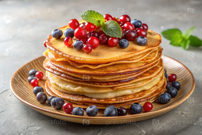 Вкусные блины с медом, ягодами, чернилами, клюквами и малиной.Концепция российского праздника Масленица