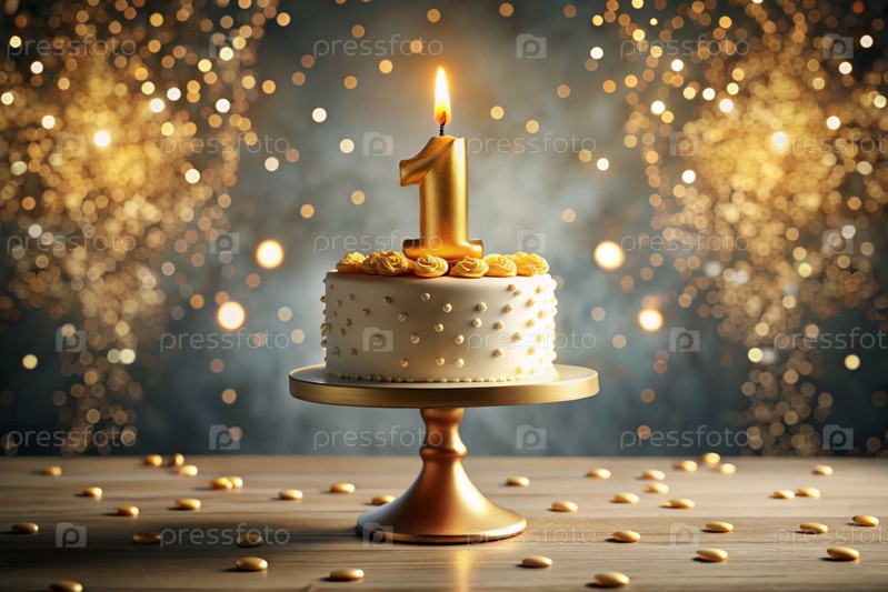 Торт для детской вечеринки. На торте номер 1. На заднем плане есть воздушные шары и красивая фотозона. Концепция - это день рождения детей