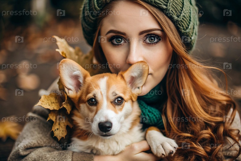 Женщина обнимает валлийскую собаку Корги в осеннем парке.Сознательная жизнь с домашним животным, концепция дружбы и любви к животным
