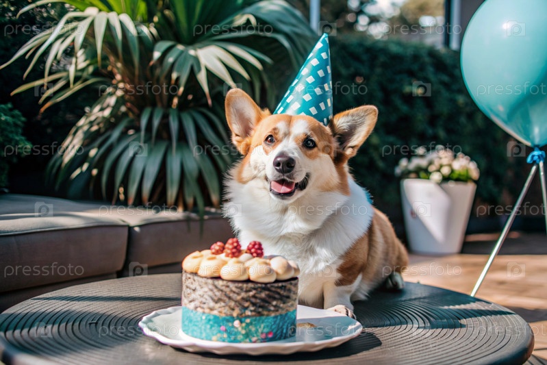 Собака сидит с тортом, воздушными шарами и флагами на вечеринке по случаю дня рождения