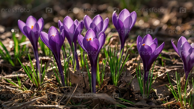 Фиолетовый крокус (лат. crocus) в ближайшем плане на утреннем солнце