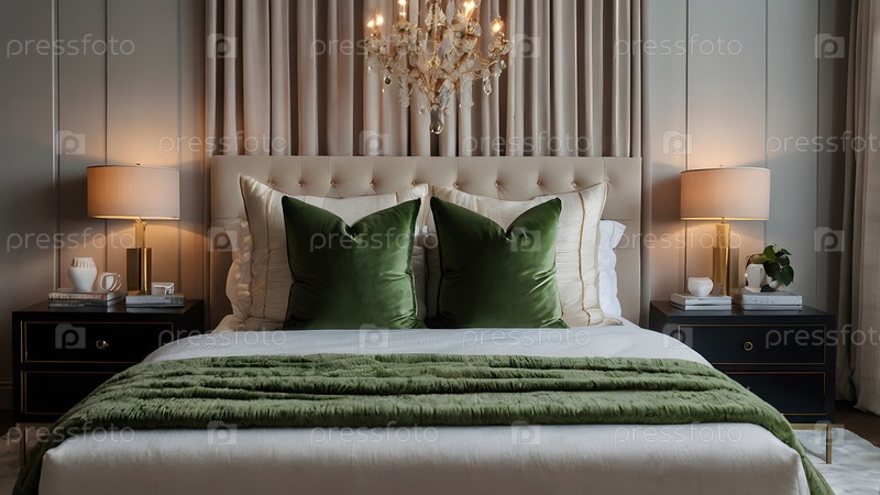 Интерьер современного дома.Минималистский уютный интерьер спальни с головкой, постельным бельем, подушками и ночным столом