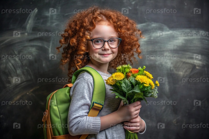 рыжеволосая скандинавская девочка со своими очками у доски. девушка держит цветы в руках. это ее первый раз, когда она ходит в школу. ребенок с рюкзаком, книгой и цветами. обратно в школу