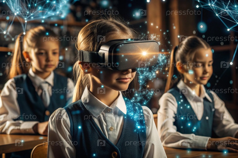 Девочка с очками виртуальной реальности. Ребенок находится в классе, а другие ученики на заднем плане. Цифровой интерфейс отображается в наушниках