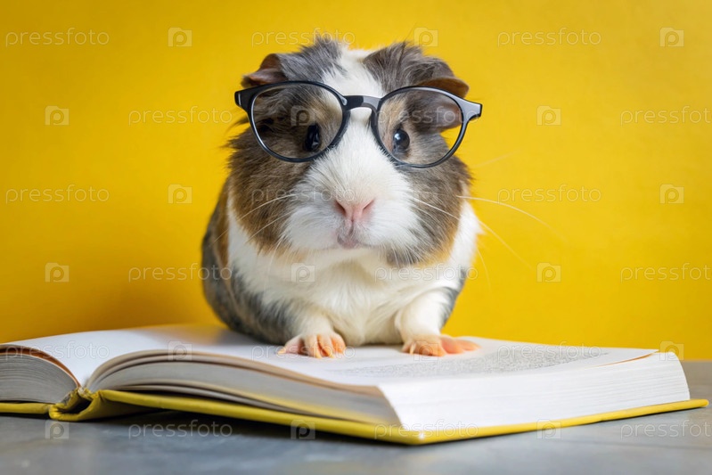 Забавная маленькая морская свинка в круглых очках читает книгу на желтом фоне