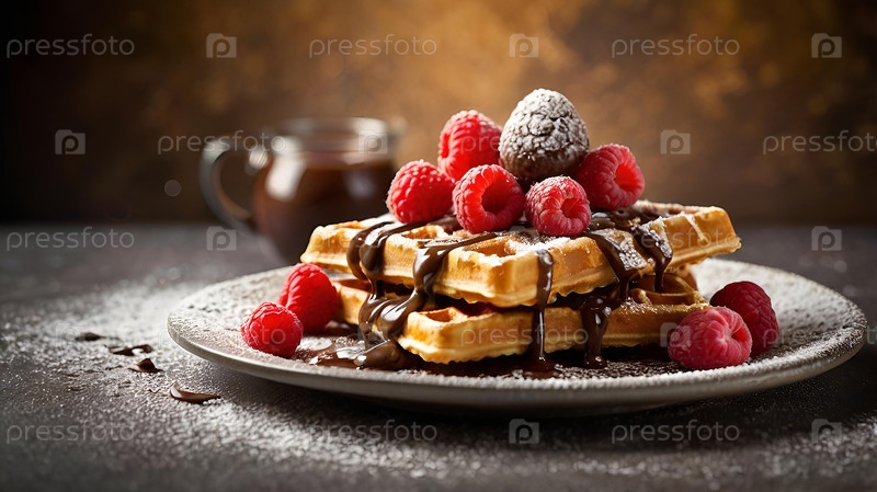 Свежевыпеченные бельгийские вафли украшены сахарным порошком, шоколадом и свежими ягодами